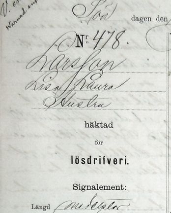 Hustru Lisa Laura Larsson, 46, häktad för lösdriveri 17 juli 1887 - polisförhör