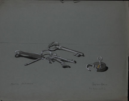 Gustav Ahlin gick i Maria folkskola och var bara 13 år gammal när han målade dessa nycklar och lås, närmast i trompe l´œil-teknik ("lura ögat").