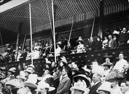 Olympiska spelen i Stockholm 1912. Kungliga läktaren vid invigningshögtidligheterna den 6 juli 1912.