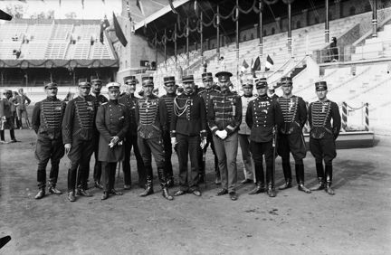 Olympiska spelen i Stockholm 1912. Gruppporträtt av prisdomarna vid fälttävlingen "Military". I mitten syns överste Bror Munch.