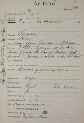 Abram Sapolski, politisk flykting från Odessa passerar Stockholm 1906 - polishandling från utlänningsexpeditionen