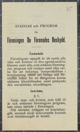 Stadgar och program för Föreningen De Förenades Beskydd - 1913