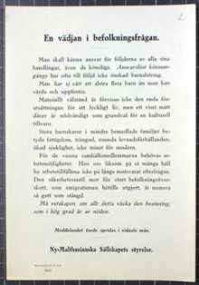 Ny-Malthusianska Sällskapet arbetade för att fattiga skulle föda färre barn och att "sjukligt belastade" helt avstod från att skaffa barn. De stred även för ett upphävande av preventivlagen, Lex Hinke.