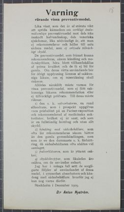 Det här flygbladet finns i Anton Nyströms personliga arkiv på Stadsarkivet. Anton Nyström hade enligt 1909 års adresskalender sin läkarmottagning på Sturegatan 15 i den numera rivna fastigheten Lönnen 17. Han titulerade sig där "Med. dr, nerv- och könssjukdomar" och hade mottagning vardagar kl. 9-10 samt 2-3.