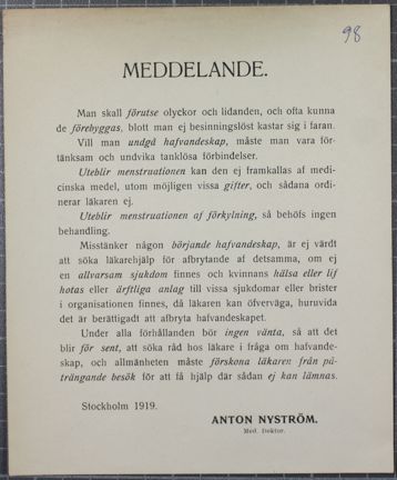 Här upplyser den kände läkaren och folkbildaren Anton Nyström om vad man kan göra om menstruationen uteblivit. Abort var inte lagligt förutom i vissa undantagsfall: