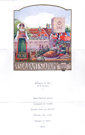 Här kommer en språkövning på franska. Menyn från OS 1912 på Restaurant Stadion, säkert startad för just detta tillfälle, är skriven på franska. Man kan se att den kostade fem kronor att intaga. Säkert mycket pengar på 1910-talet. Menyn är fint illustrerad med servitris i färgglad folkdräkt och stadion syns naturligtvis i bakgrunden!