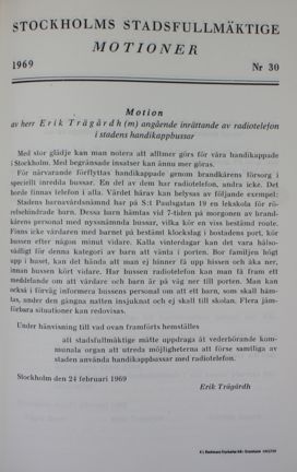Motion angående inrättande av radiotelefon i stadens handikappbussar - Erik Trädgårdh (m), Stadsfullmäktige 1969