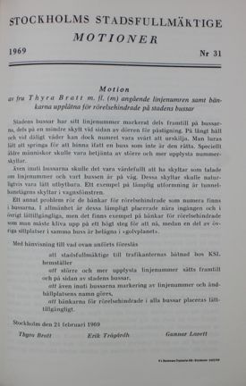 Motion angående linjenumren samt bänkarna upplåtna för rörelsehindrade på stadens bussar - Thyra Bratt (m) m. fl., Stadsfullmäktige 1969