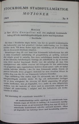 Motion angående kommunala bidrag till icke statsbidragsberättigade skolor med högstadium i Stockholm - Stadsfullmäktige 1969