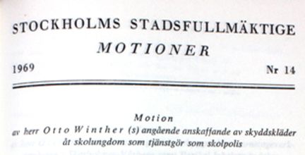 Motion angående anskaffande av skyddskläder åt skolungdom som tjänstgör som skolpolis - Stadsfullmäktige 1969