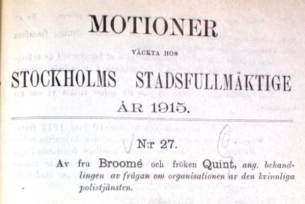 Sedan 1907 hade det funnits kvinnliga polisbiträden i staden. Deras arbete var löst organiserat och man hade inte bestämt sig för om kvinnorna inom polisen skulle vara kvar på sikt. Enligt motionärerna Stina Quint och Emilia Broomé var det, efter åtta år, dags att sluta betrakta de kvinnliga polisbiträdenas arbete som ett tillfälligt experiment och skapa en fast organistion för dem.
