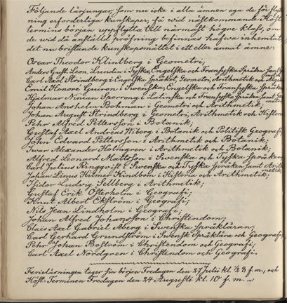 Elever som inte hade tillräckliga kuskaper i något eller några ämnen blev inte uppflyttade till en högre klass utan att först ha genomgått en särskild prövning. I förteckningen över flyttningar kan man läsa att August Strindberg hade bristfälliga kunskaper i geometri, arithmetik och historia och därför behövde göra en prövning i de ämnena för att kunna flyttas till nästa klass.