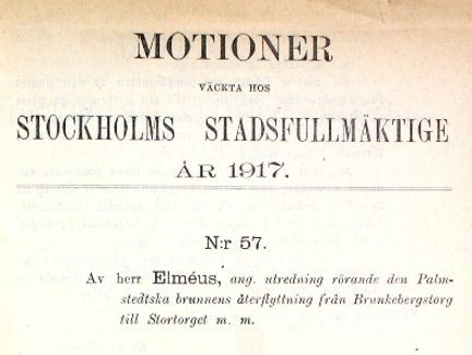 Motion angående utredning av den Palmstedtska brunnens återflyttning till Stortorget från Brunkebergstorg - Stadsfullmäktige 1917