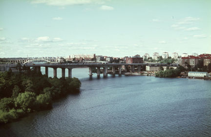 Utsikt mot Essingebron från sydost.T.h. Lilla Essingen. I fonden Tranebergsbron och Fredhäll