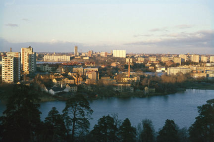 Utsikt över Trekanten, Gröndal och Liljeholmen norrut. Från Nybohovsberget. Under Essingeledens anläggande