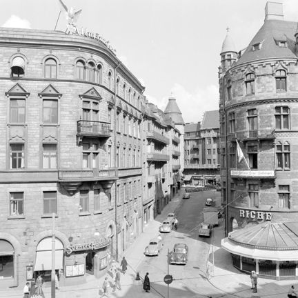 Smålandsgatan från Birger Jarlsgatan mot Nybrogatan. T.v. kvarter Skravelberget Större och t.h. Matrosen