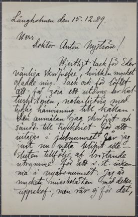 Hjertligt tack för Eder vänliga skrifvelse, hvilken mycket gladde mig. Tack ock för löftet att få göra ett utdrag ur Kulturhistorien, naturligtvis med tydlig hänvisning till källan. Den anmälan jag skrifvit och sändt till tryckeriet för att intagas i julnumret får jag just nu veta blifvit utesluten tillfölje af bristande utrymme för att i.st. inkomma i nyårsnumret. Jag är mycket missbelåten med detta uppskof, men rår ej för det, ty jag kan ej härifrån öfvervaka ombrytningen, utan har t. v. måst öfverlemna detta åt boktryckaren. Dock skall det snart blifva ändring häri.