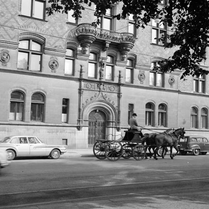 Strandvägen 31, portal och del av fasad till "Bünsowska huset". En man med två hästar och vagn passerar