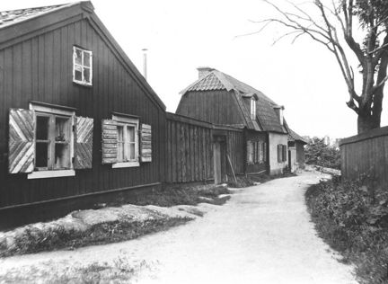 Motiv från Bergsprängargränd med låg träbebyggelse.