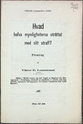 Enligt omslaget är talet "hållet i Malmö samma dag förf. frigafs ur fängelset och, återupprepadt i Norrköping, åtaladt af stadsfiskal A. Linden, men utan polisens ingripande återupprepadt vid Lilljans i Stockholm inför 5000 åhörare."