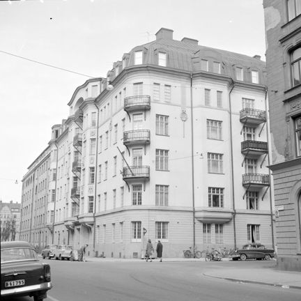 Kvarteret Gnistan i hörnet Grevgatan/Kommendörsgatan.Kommendörsgatan till vänster