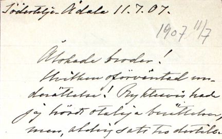 Jag hade väntat mig lite mera detaljerad beskrifning på din blifvande hustru, något om hennes Familj- och lefnadsförhållande – endast ”Tyra Degermark” – (Förmodar du gifvit henne ett nätt smeknamn istället för förnamnet.) Måtte hon i verkligheten äga alla de dygder du uppgifvit, så, att du ej för 3:dje gången blir besviken. Syster Emma vill försöka slå döförat till och endast tänka på din lycka, som hon dock så innerst önskar, ty, lycklig som man och Far har du då aldrig varit. Denna underrättelse kommer nog att röra upp lilla Lina, som ansåg att lagliga skiljsmessan redan kastade skugga på dig. Hon är för närvarande annars i [svårtydd ort], varit dålig på sednare tiden. Emma mår godt och är nöjd med sin nya bostad.