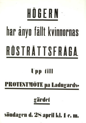 Denna affisch är från 1918. Antagligen så fanns det ett visst motstånd mot kvinnlig rösträtt fortfarande! Men 1919 togs i alla fall beslutet att införa lika rösträtt för kvinnor. Det första valet som kvinnorna kunde rösta i var riksdagsvalet 1921.