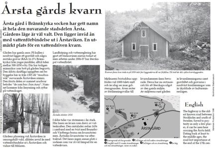 Årsta gård i Brännkyrka socken har gett namnåt hela den nuvarande stadsdelen Årsta. Gårdens läge är väl valt. Den ligger invid ån med vattenförbindelse ut i Årstaviken. En utmärkt plats för en vattendriven kvarn.