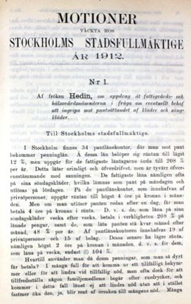 På grund av ovanstående vill Hedin att Hälsovårdsnämnden och Fattigvårdsnämnden ska utreda ”i hvad mån det nuvarande systemet att mot pant af kläder och sängkläder utlåna penningar mot hög ränta kan innebära skada i ekonomiskt och hygieniskt hänseende för den enskilde och därigenom för staden såsom kommun, samt därefter vidtaga de åtgärder, förhållandena påkalla.”