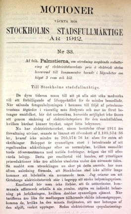 Motion om utredning angående rabattering af elektricitetsverkets pris å elektrisk ström levererad till konsumenter boende i lägenheter om högst 3 rum och kök - Stadsfullmäktige 1912