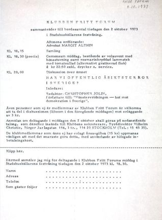 "Har vi offentlig åsiktsterror i Sverige?" undrade man på Klubben Fritt Forums sammanträde i oktober 1973.