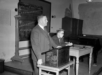 Karlavägen 79, Högre allmänna läroverket å Östermalm (Östra Real). Elevrådet diskuterar politik