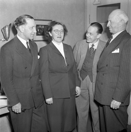 Hötorget 8, Konserthuset. Diskussion i ämnet "Ska vi träta om trafik?". Ingenjör E. Walter Holmstedt, Astrid Hjelmström, direktör Raymond Sjöqvist, general Nils Stenbeck