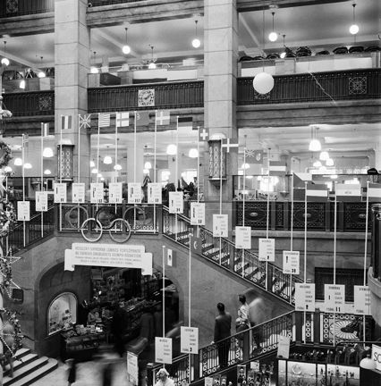 Hamngatan 18-20, NK. Ljusgården. OS-flaggor med respektive länders resultatsiffror