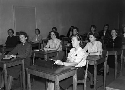 Sysslomansgatan 1, Statens polisskola. Den första teoretiska kursen för kvinnliga poliser startar. Deltagare i bänkarna