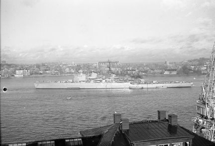 Strömmen. Vy mot Skeppsholmen/Kastellholmen (Nordiska museet i bakgrunden). Kryssaren Göta Lejon