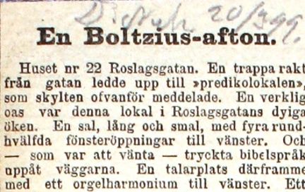 Fredrik August Boltzius (1836-1910) var en värmländsk helbrägdagörare som fick många såväl beundrare som belackare. Genom handpåläggning och Guds åkallelse påstod han sig kunna läka sjuka människor. Här skildras Boltzius seans på Roslagsgatan 22 av en mycket kritisk Klas "Ejnar" Ryberg en afton 1899.
