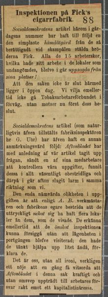 Den här artikeln i Socialdemokraten skildrar hur fabriksinspektör Gustaf Uhr blir lurad av tobaksfabrikanterna Fick på Kaptensgatan 20 vid en inspektion av fabriken. Bröderna Fick lyckas enligt artikeln dölja en lokal där 15 arbetare jobbar i en undermålig miljö.