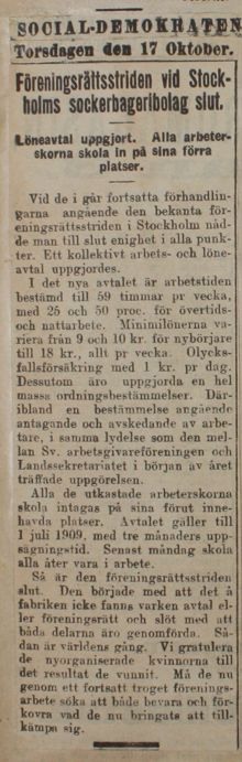 Enligt den här artikeln i Socialdemokraten hade 60 kvinnor anställda vid Stockholms Sockerbageribolag på Mästersamuelsgatan 35 blivit avskedade när de sökt medlemsskap i Svenska bageri- och konditoriarbetareförbundet.