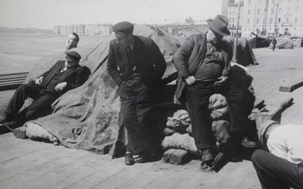 Arbetare tar lunchrast vid Riddarholmshamnen, okänt år, troligen slutet på 1930- eller början på 1940-talet.