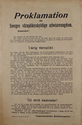 Den här pamfletten är tryckt i Stockholm 1914, året då första världskriget började. Då pågick en intensiv debatt om försvarspolitiken. Den allmänna värnplikten hade införts 1901 men av den här pamfletten att döma diskuterades vid tillfället en utökning av värnpliktstiden till 1 år. Ungsocialisterna uppmanar därför här Sveriges unga män att värnpliktsstrejka. De skriver bland annat: