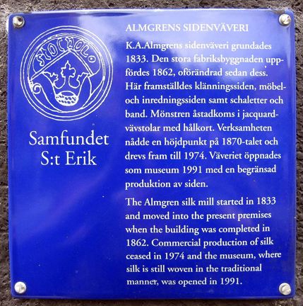 The K.A.Almgren silk mill started in 1833 and moved into the present premises when the building was completed in 1862. Commercial production of silk ceased in 1974 and the museum, where silk is still wowen in the traditional manner, was opened in 1991.