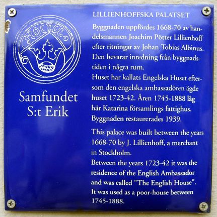 This palace was built between the years 1668-70 by J Lillienhoff, a merchant in Stockholm. Between the years 1723-42 it was the residence of the English Ambassador and was called ”The English House”. It was used as a poor-house between 1745-1888.
