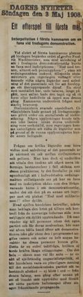 Här rapporterar Dagens Nyheter om att grev Fredrik Wachtmeister vid en interpellation frågat statsministern om några åtgärder skulle vidtagas. Statsministerns svarade att undersökning inletts. Dagens Nyheter ger sedan sin syn på polisens insats under första majdemonstrationen.