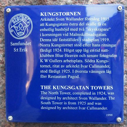 The Kungsgatan towers, The North Tower, completed in 1924, was designed by architect Sven Wallander. The South Tower is from 1925 and was designed by architect Ivar Callmander. (1998)