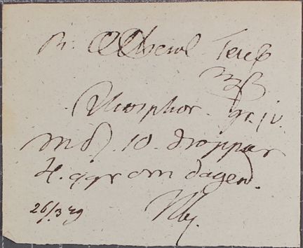Får undertecknad ödmjukast anmäla: att jag ofta mot [svårtytt sjukdomstillstånd] begagnar en composition af: Terpentinolja ett halft uns och Phosphor 4 gram, hvaraf tages 10 droppar 3-4 ggr om dagen.