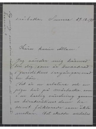 Jag vänder mig härmed till dig, som är bevandrad i juridikens irrgångar, med en bön. Det är en arbetare och en piga här på Mårbacka som i en hastig vändning genom en häradsrättens dom har blivit förklarade vara äkta makar. Det skedde alldeles mot bådas önskan och utan att de ens förstodo vad det var frågan om. De vara svåra ovänner redan vid rättegångstillfället och ha så förblivit ända tills denna dag. Nu önskar karlen emellertid att bli fri från förbindelsen och för att detta skulle kunna ske och det besynnerliga äktenskapet upphöras, fordras för det första, att man får ett utlåtande från Svea Hovrätt med förklaring, att domen inte vid Hofrätten har blivit överklagad. Skulle du vilja vara så vänlig och skaffa ett dylikt intyg? Jag medsänder en avskrift av domen för att detta må kunna gå för sig. Möjliga kostnader be vederbörande att få ersätta