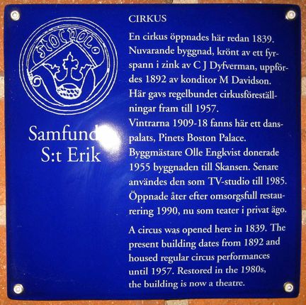 En cirkus öppnades här redan 1839. Nuvarande byggnad, krönt av ett fyrspann i zink av C J Dyfverman, uppfördes 1892 av konditor M Davidson. Här gavs regelbundet cirkusföreställningar fram till 1957. Vintrarna 1909-18 fanns här ett danspalats, Pinets Boston Palace. Byggmästare Olle Engkvist donerade 1955 byggnaden till Skansen. Senare användes den som TV-studio till 1985. Öppnade åter efter omsorgsfull restaurering 1990, nu som teater i privat ägo.