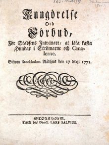 "I anseende til de tid efter annan deröfwer försporde klagomål, at en stor hop hundar, till hwilka inga ägare finnas, jämwäl andra stora hundar, derigenom at deras ägare ej hålla dem instängde eller i band, så om dagar, som nätter, flodtals löpa omkring Staden och Malmarne, samt ej allenast medelst tjutande och bitande finns emellan, förorsaka mycket buller och oljud, hwarigenom folk i deras natte-ro förstöras, utan ock tilfoga folk och särdeles små barn skada och olägenhet; hafwa wäl särkildte Publicationer af den 16. Maji 1735, 3. Septembris 1739, 1. Martii 1745, 13. Junii 1747, och 13. Januarii 1748. til förekommande deraf blifwit utfärdade, men som sådant oagtat, hwarjehanda efterlåtenhet och försummelse härutinnan hos Stadens Inwånare dageligen förspörjes; Så föranlåtes Högwälborne Herr Grefwen, Fältmarskalken och Öfwer-Ståthållaren Samt Riddaren och Commendeuren af Kongl. Maj:ts Orden, tillika med Magistraten, än ytterligare alfwarligen antyda och warna denne Stadens Inwånare, at, wid, Tijo Daler Silfwermynts böter, innestänga eller i band slika dem tilhöriga stora hundar, så at de ej, på sätt, som härtils skedt, måge om dagar eller nätterne löpa omkring kring Staden och Malmerne; Warande för öfrigit, hwad angår de så kallade wilda hundar, eller de till hwilka inga ägare finnas, eller sådane, som går omkring, utan at vara märkte med halsband, den anstalt gjort att samma hundar om aftnorne, sedan mörkt blifwit, och om nätterne, skola af wisse dertil antagne personer, dödas och ihjälskjutas; Och hafwa således Stadens inwånare at skylla deras egen owarsamhet, om ibland desse senare hundars antal, deras hundar på en slik förbunden tid äfwen blifwa dödade och ihjälskjutne. Stockholms Rådhus, den 18. April år 1755."