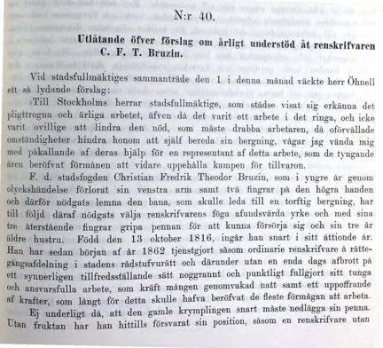1895 motionerar fullmäktigeledamoten Richard Öhnell om att den 78-årige renskrivaren Christian Fredrik Theodor Bruzin inte längre förmår arbeta och bör beviljas pension - trots att han inte varit "direkt anställd i stadens tjenst". Bruzin jobbade i yngre år som stadsfogde men förlorade vänsterarmen och två fingrar på högerhanden i en olycka. Efter det blev han tvungen att, med sina tre återstående fingrar, försörja sig som renskrivare i stadens rådhusrätt, något han gjort sedan 1862.